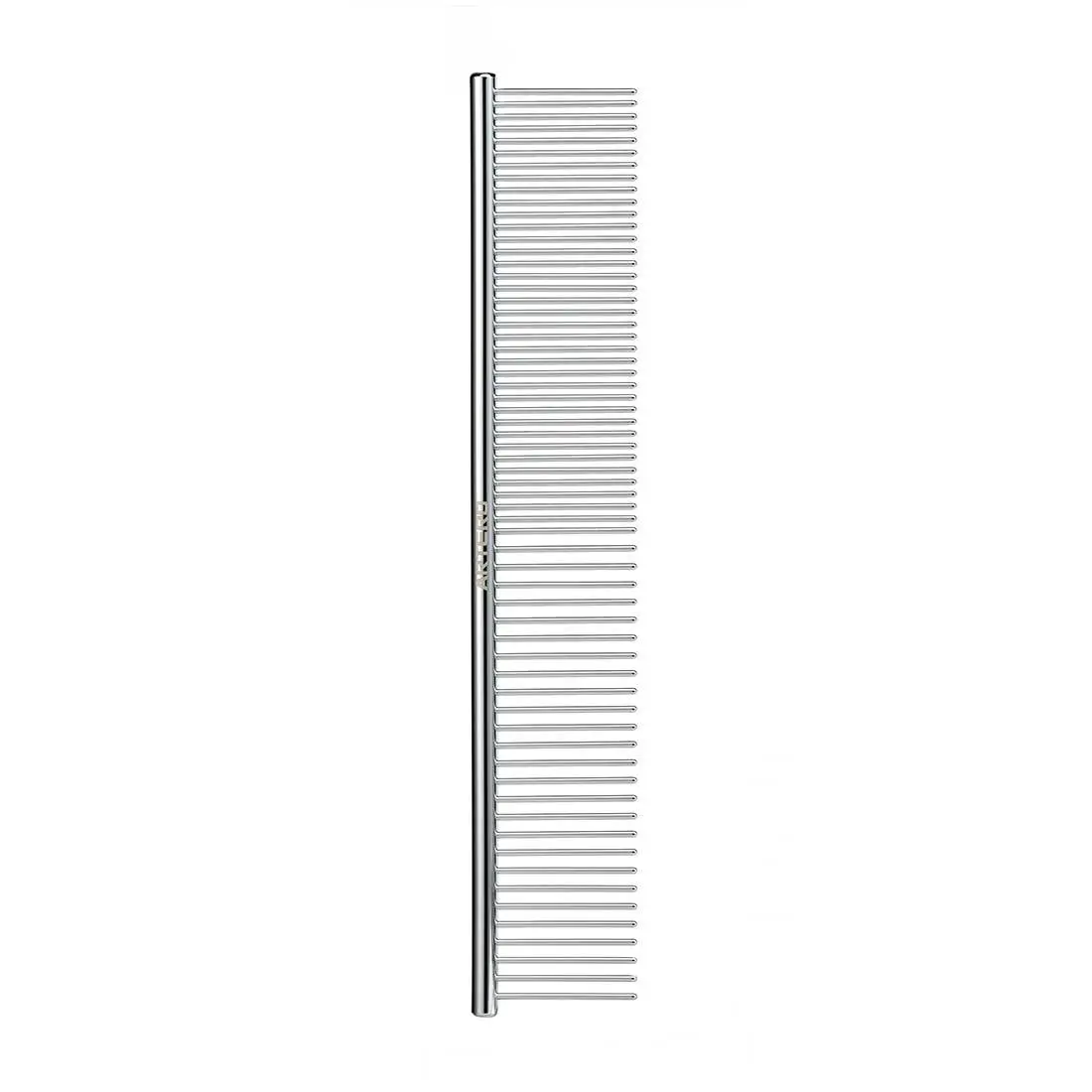 The Artero Ginger Short Pin Comb features chrome-coated spikes that prevent oxidation and provide smooth sliding through the coat. This reduces friction, minimizing frizz and preventing unnecessary hair breakage. Its regular-length pins effectively open the coat, eliminate tangles, and remove loose hair. The comb is designed with both a wider and narrower section for versatile grooming across different coat areas.