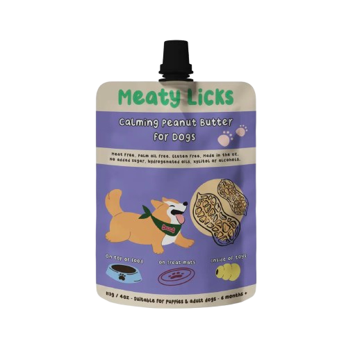 Meaty Licks Calming is a premium vegan, gluten-free peanut butter pouch crafted specifically for dogs. Made in North Wales, UK, without any artificial ingredients, perfect for dogs with dietary sensitivities or pet owners seeking plant-based, wholesome treats.
