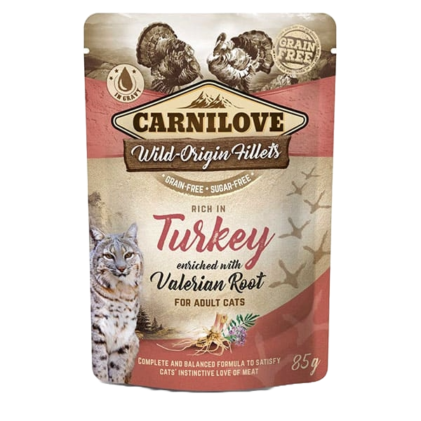 85% meat in fillets (71% chicken, 14% turkey), 12% broth, 1% valerian root, 1% linseed oil, 0.5% minerals, 0.5% vegetable starch.