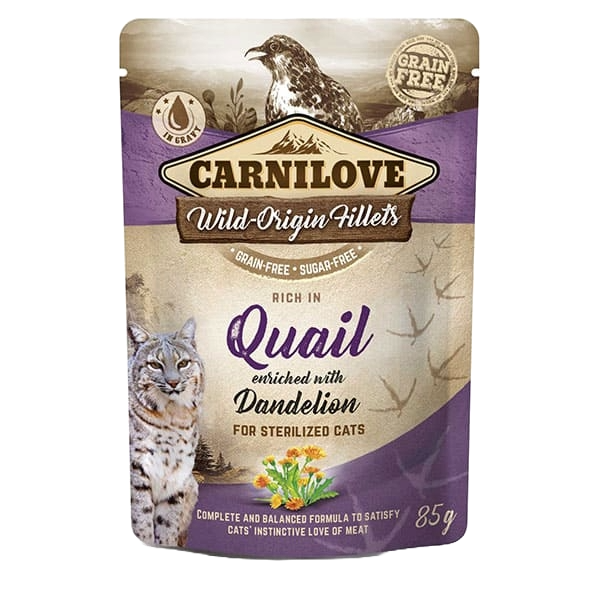 85% meat in fillets (71% chicken, 14% quail), 12% broth,1% dandelion, 1% linseed oil, 0.5% minerals, 0.5% vegetable starch.