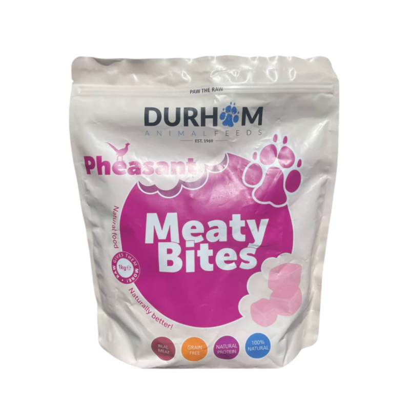 Pheasant Meaty Bites are a finely minced blend of 80% pheasant meat, 10% bone, and 10% offal including liver and heart. This natural protein source may contain shot and provides a balanced, nutritious meal for dogs.