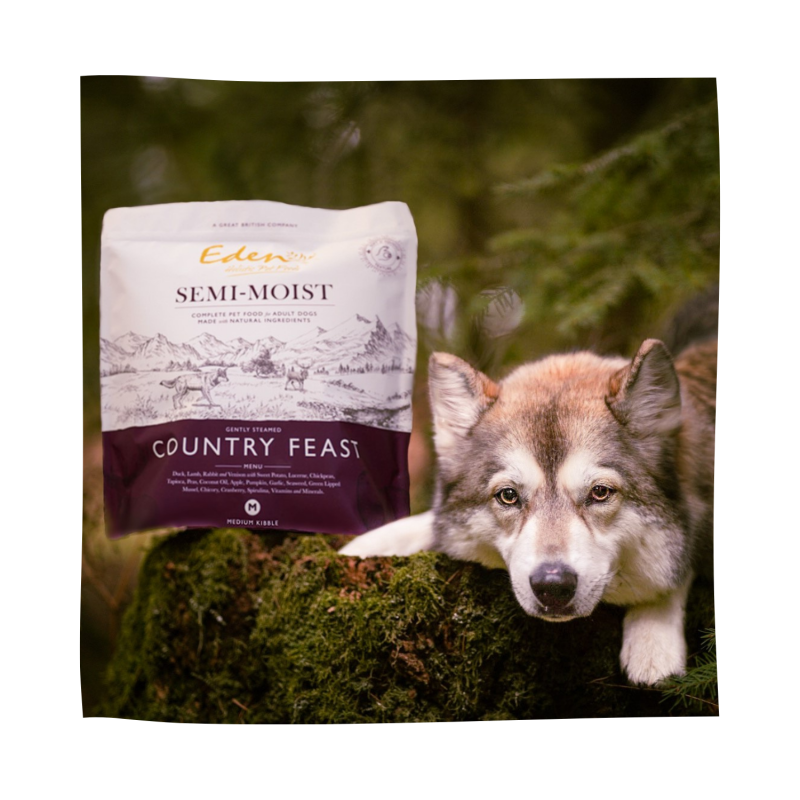 Eden Semi-Moist Country Feast is a naturally complete, grain-free dog food designed for active and healthy dogs. This premium recipe features freshly prepared duck, lamb, rabbit, and venison, providing essential amino acids that aid tissue repair and support vitality.