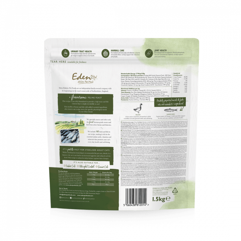 This premium recipe combines freshly prepared duck with nutrient-rich sardines, creating a luxurious meal that will captivate your cat’s appetite. Formulated specifically for adult and senior cats, it includes important joint-supporting ingredients such as Glucosamine, MSM, and Chondroitin Sulphate to help maintain healthy joints and cartilage — essential for maintaining agility and comfort, especially in older cats.
