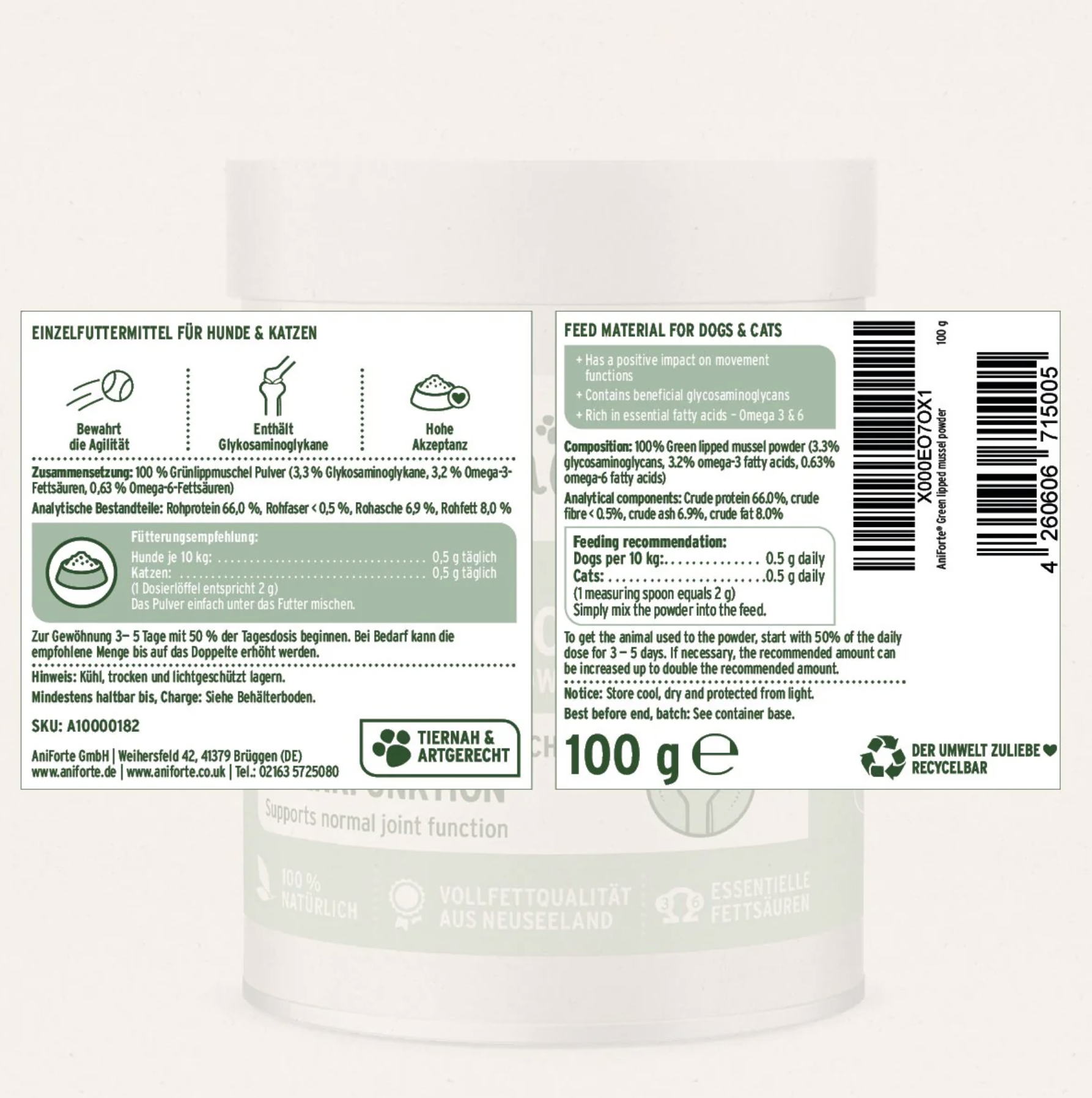 AniForte’s Green Lipped Mussel Powder is one of our most trusted and effective joint supplements. Sourced from licensed marine farms in New Zealand and gently freeze-dried, it retains its full nutrient profile to support healthy joints and tendons in dogs, cats, and horses.