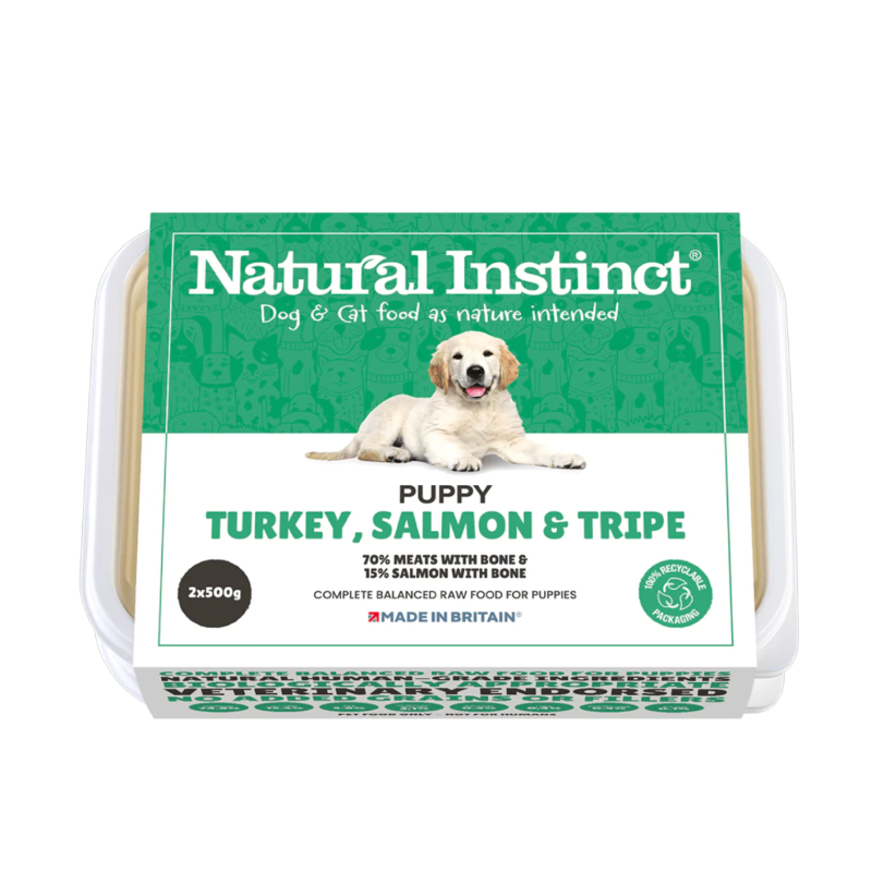 Natural Instinct Puppy Turkey, Salmon & Tripe is a complete and balanced raw food designed for puppies over 8 weeks old. This flavour-packed frozen recipe combines a variety of high-quality proteins: turkey with bone (37%), turkey heart (10%), salmon with bone (15%), beef green tripe (14%), beef heart (5%) and beef liver (4%), along with fruits, vegetables, and superfoods.