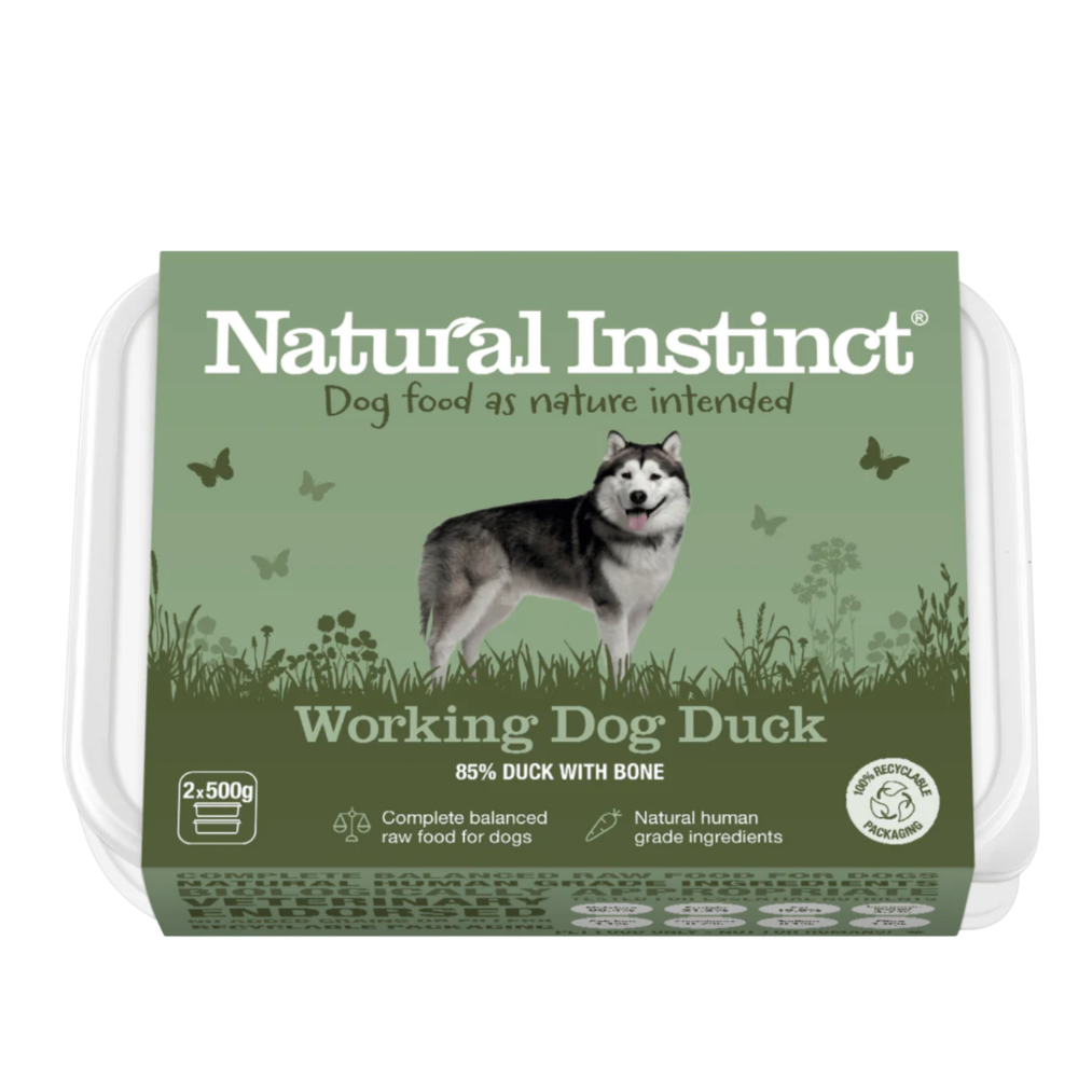 Natural Instinct Working Dog Duck is a complete, balanced raw dog food designed for high-energy working dogs. This frozen feast contains human-grade duck meat with bone (85%), vegetables, fruits, and added Vitamin C. Naturally high in fat, this recipe is excellent for weight gain, while the added Vitamin C supports the immune system, ligaments, and joints to keep your dog healthy.