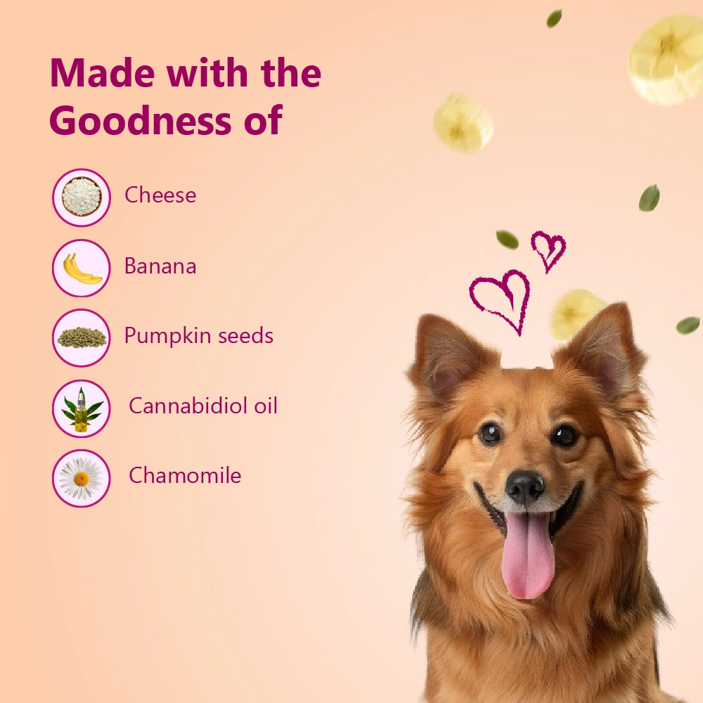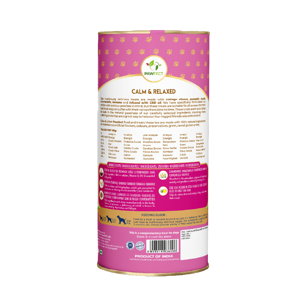 Crafted to support calm behavior and relaxation, these freeze-dried treats are made with a gentle, natural blend of calming ingredients. Combining the creamy richness of cottage cheese with banana, pumpkin seeds, chamomile, and aloe vera oil, they offer a nutritious and delicious way to help your dog unwind.