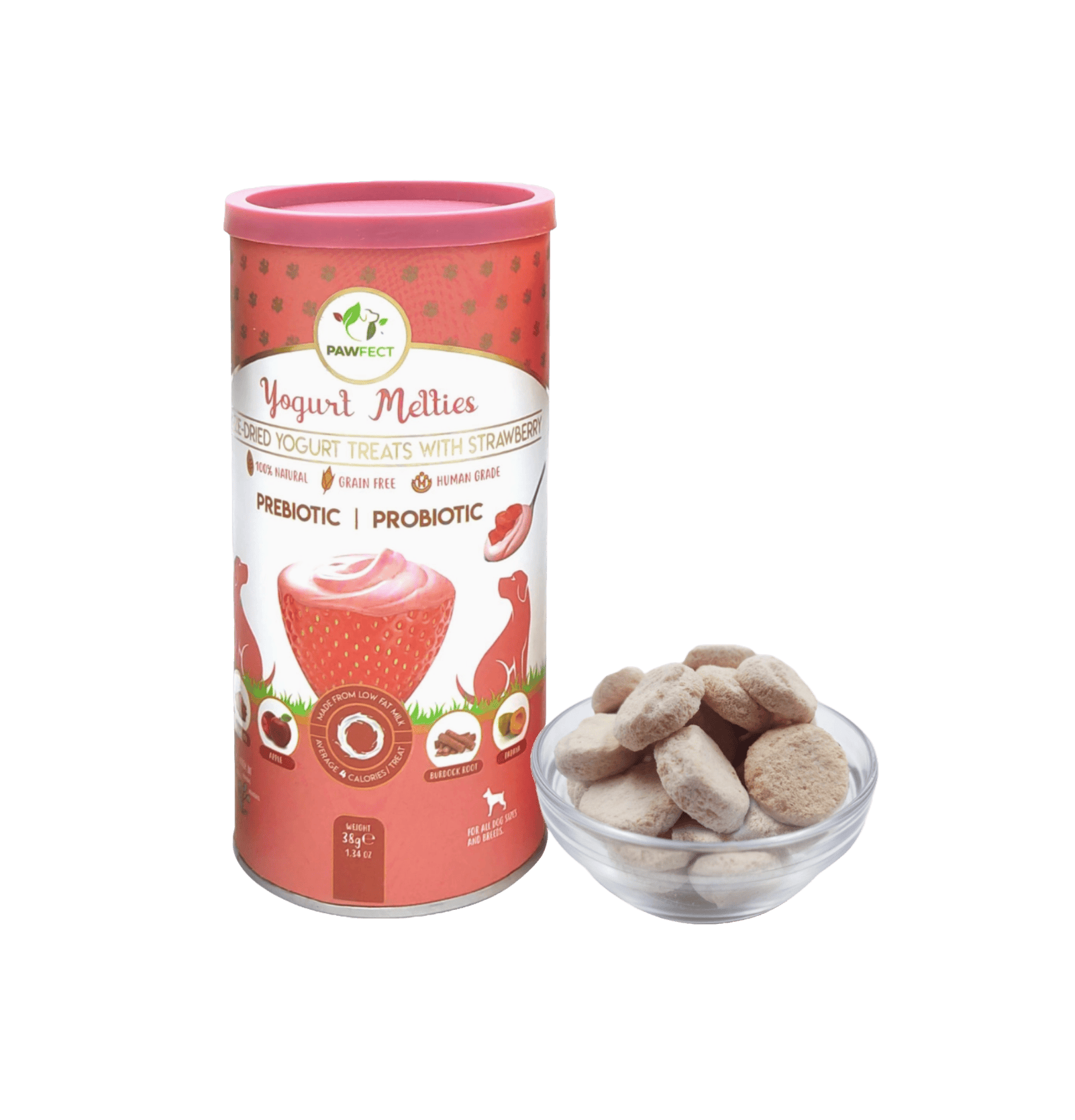 Delicious, gut-friendly soft treats made with a powerful blend of natural ingredients to support digestion and promote a balanced gut microbiome. Formulated with yogurt, strawberry, apple, papaya, and burdock root, plus added prebiotics and probiotics, these treats are perfect for daily digestive support.