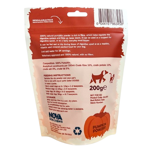 Pumpkin Powder (200g) is a 100% natural, veterinary-approved supplement designed to support your pet’s digestive health. Naturally rich in fibre, it helps to regulate the digestive system, firm up loose stools, and provide gentle relief during times of digestive upset.