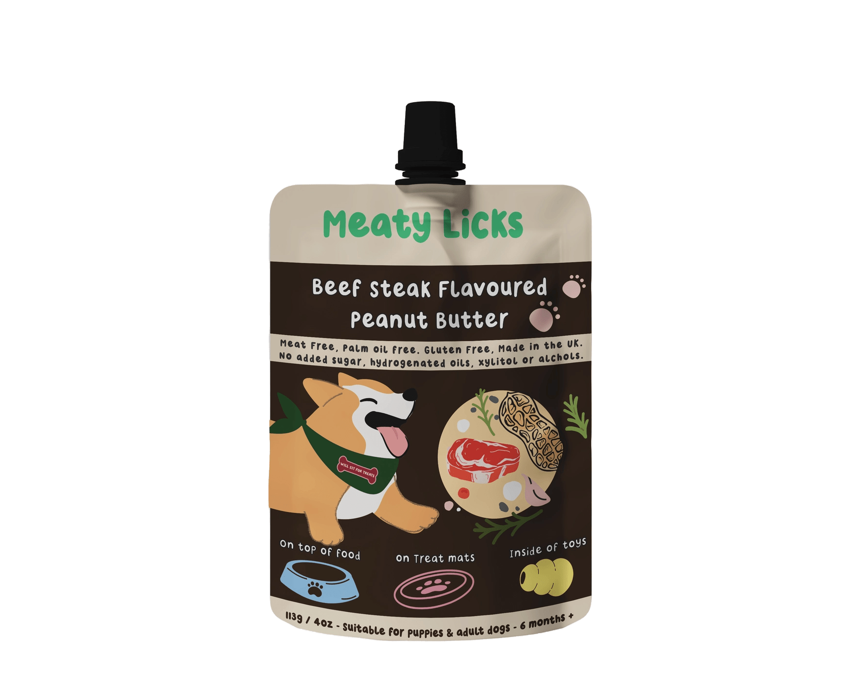 Meaty Licks Roast Beef is a premium vegan, gluten-free peanut butter pouch made especially for dogs. Crafted in North Wales, UK, it offers a rich and savory roast beef flavour without any artificial ingredients, making it ideal for dogs with dietary sensitivities or pet owners seeking natural, plant-based treats.