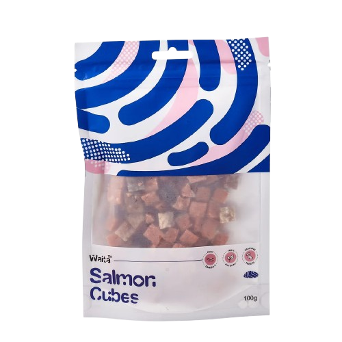 Waita Air-Dried Salmon Cubes are gently dried to preserve natural nutrients and flavour. Rich in Omega-3 fatty acids, protein and antioxidants, they support healthy skin, a glossy coat, joint mobility and cognitive function.